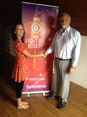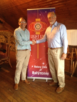 Rotarians John Dempsey and Noel Campbell handing out the charity cheques to Salvation Army, St Vincent de Paul, Multiple Sclerosis, Cheers Youth Club, Age Concern, Childrens Brain Injury Trust, Ballymoney Independent Gateway Club, Christians Against Poverty, and Ballymoney Food Bank
